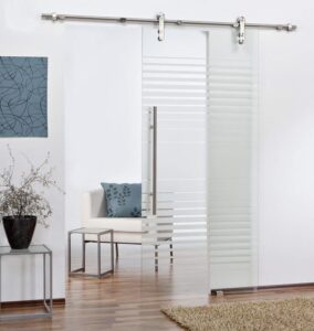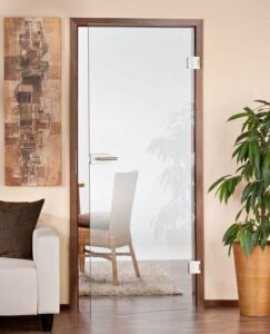 Türblatt mit Röhrenspaneinlage, 5-fach Lackierung, Designkante, in den gängigen DIN Größen Glastür ESG Sicherheitsglas 8 mm, satiniert mit klaren Streifen Zarge